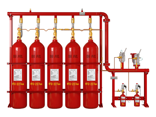 在外贮压式气体灭火系统中,灭火剂(如 HFC-227ea)与驱动气体(氮气)分别储存在灭火剂瓶组和驱动气体瓶组中。火灾发生时,驱动气体瓶中的氮气释放进入灭火剂瓶组,推动灭火剂通过管网输送至防护区,实现快速灭火。